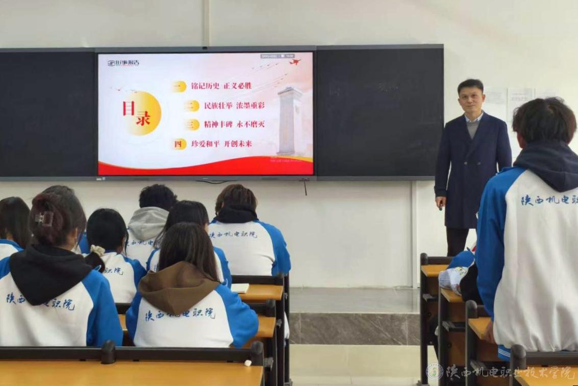 11月4日下午,陕西机电职业技术学院党委委员、院长助理赵争东在启航楼206教室为25铁道运管1班学生讲授形势与政策课《纪念抗战胜利 坚定民族信念》专题内容。