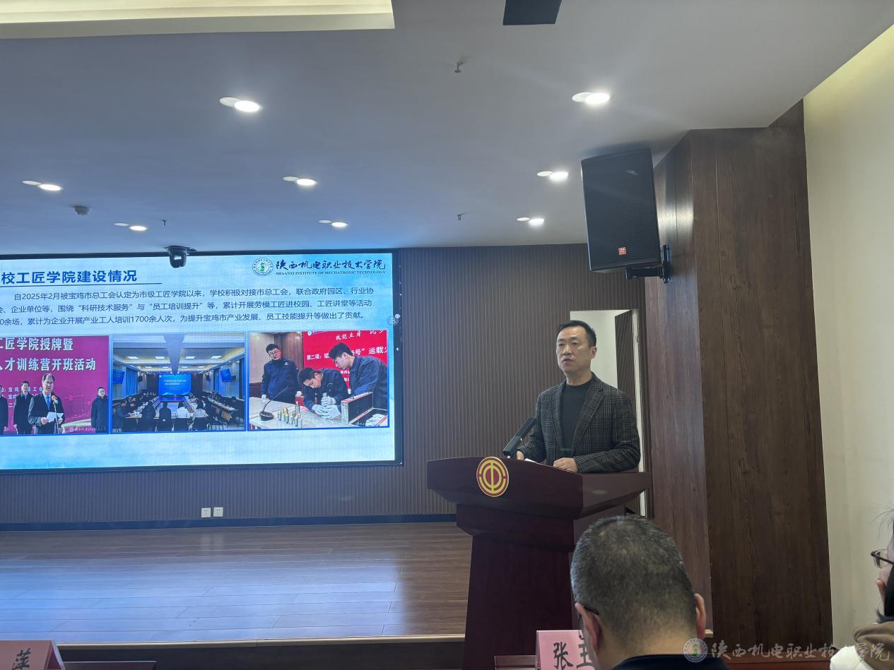 11月19日,宝鸡市总工会举办宝鸡市工匠学院数智化建设现场交流会暨助力产教融合技能人才工匠培训开班活动。学校党委委员、副校长张克带队参加活动并作专题汇报。