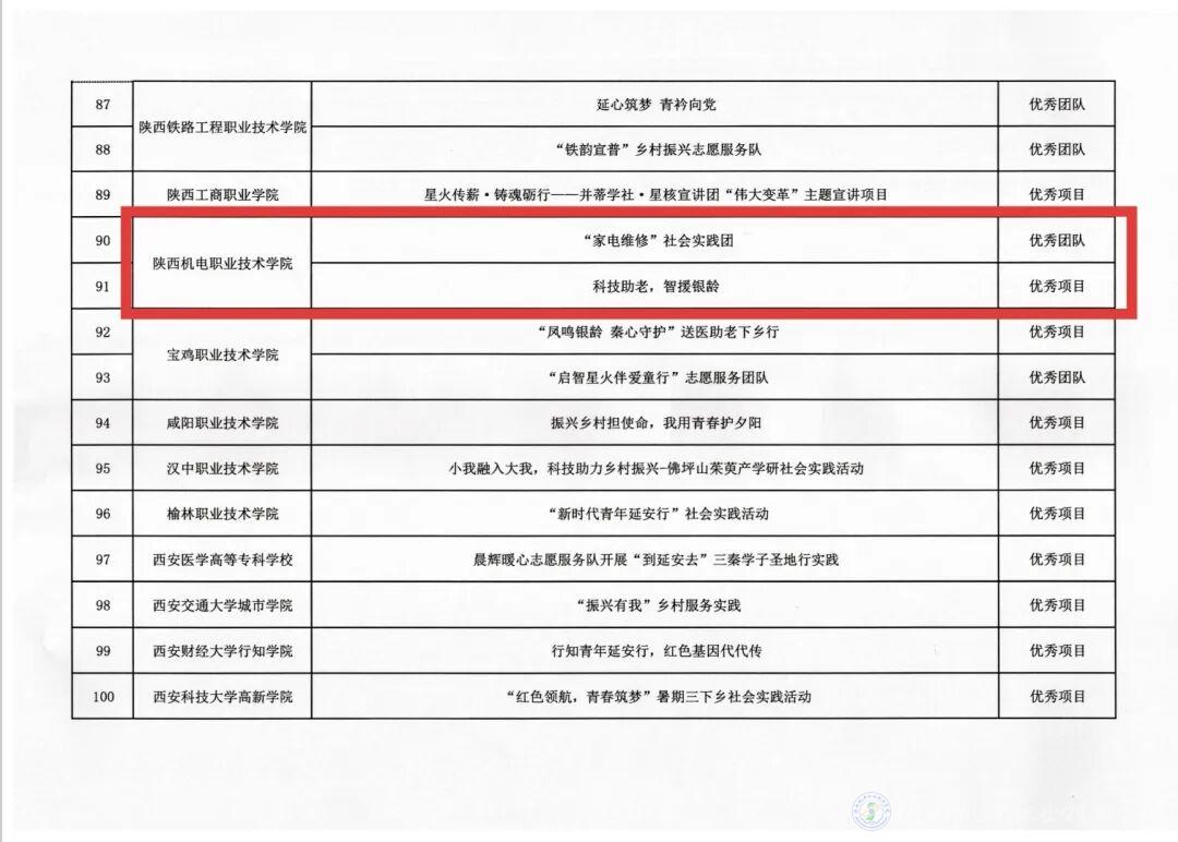 近日,共青团陕西省教育工作委员会发布《关于2025年度“小我融入大我,青春献给祖国”高校师生主题社会实践项目拟表扬对象的公示》。陕西机电职业技术学院凭借扎实的实践成果脱颖而出,“家电维修”社会实践团成功获评“优秀团队”;“科技助老,智援银龄”成功获评“优秀项目” 称号。