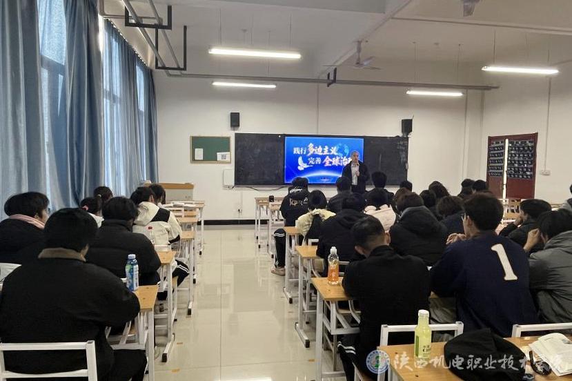 12月25日下午,陕西机电职业技术学院党委副书记、校长侯晓方在博学楼213教室为25现代通信1、25现代通信2合班学生讲授形势与政策课《践行多边主义 完善全球治理》专题内容。
