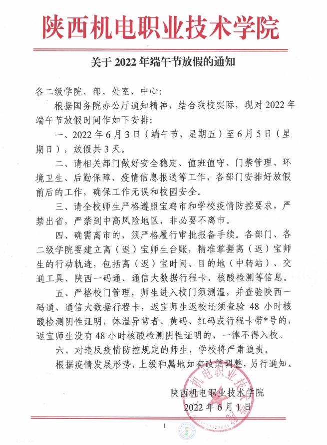 陕西机电职业技术学院关于2022年端午节放假的通知